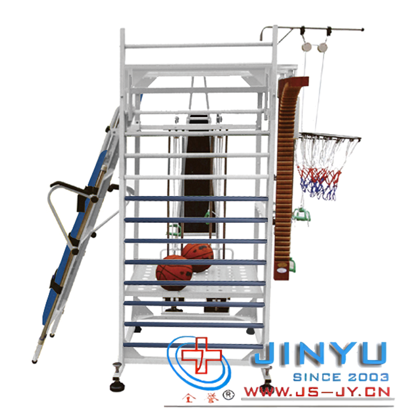 组件:踝关节练习器、肋木、肩梯、胸背部矫正运动器、复式墙拉力器、滑轮吊环训练器、运动篮球架。